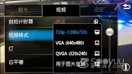 摄像方面,配备了专门的快捷键,支持1280x720,即720p的视频录制与回放。同样支持白平 衡、自拍定时、色彩效果等设置,此外还可为视频片段添加位置标记,功能十分强大。