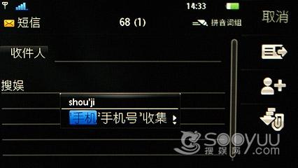 索尼爱立信U5i的短信功能继承了塞班S60系统V5版的优秀传统,输入非常方便,虚拟键盘很大 而且联想也很到位,比很多第三方输入法好用。