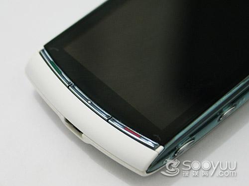 作为一款多媒体娱乐手机 ,在手机四周安排了不少的接口。首先来看顶部,索尼爱立信U8的顶部 和底部是相对较尖的,即便如此在顶部能看到电源键和解锁键,只不过这个按键也更加偏向于后盖的位置 。