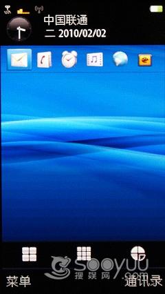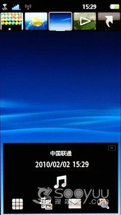 这款手机的待机界面和索尼爱立信U5几乎是完全一样的,上边有五屏,可以选择不同的动态桌面,而下边则是功能快捷键,可以进行拨号、短信等。在主题设置中可以进行修改。
