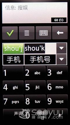 在这里我们重点说明一下U8的全键盘,在全键盘输入的 时候界面与N97相似,支持连续智能输入,按下空格键确认。而左下角的蓝色方块键是用来切换输入法的 ,整个操作都非常的方便,表现不错。