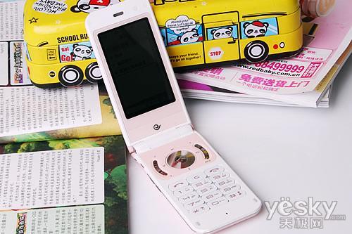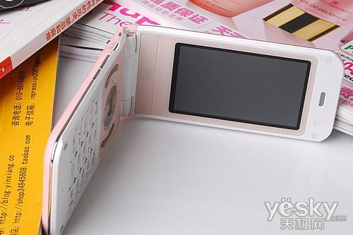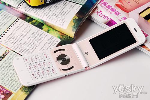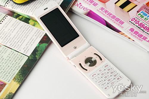 除粉色系与翻盖造型,手机材质以塑料为主的特点也有所体现,虽然手感方面,塑料材质机身稍显轻浮,但考虑年轻人爱玩爱闹的特点和人群定位,反而更加贴切,109.5g的手机重量在各类玩家手中都游刃有余。