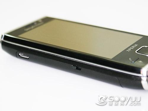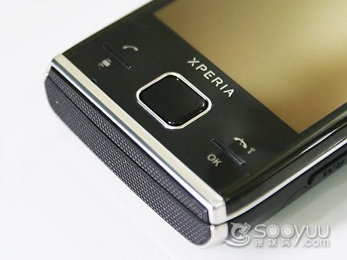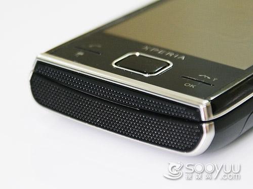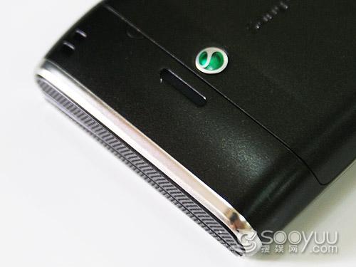 在机身下半部分除了扬声器之外还能看到索尼爱立信最新的logo设计以及左下角的一个挂饰孔。 在黑色磨砂金属壳的衬托下手机更为炫目。
