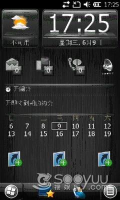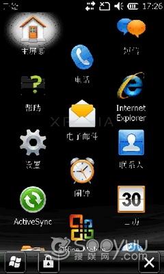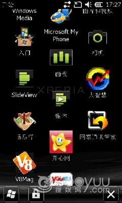 点击“视窗”键依然会进入主菜单界面,在这里表现和大多数WM手机基本上是一样的了,图标 采用了蜂窝样式的排列,通过上下滑动来切换。值得一提的是行货版的X2i相比改版机增加了一些应用程 序,比如大智慧、畅易行、开心网、网秦通讯管家以及优酷网等,都是国人平时经常用到的软件。