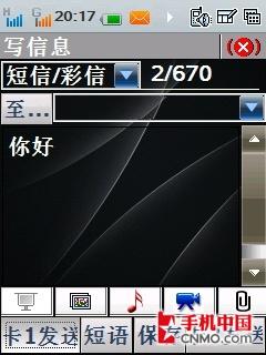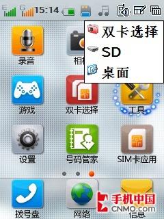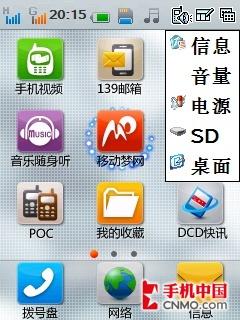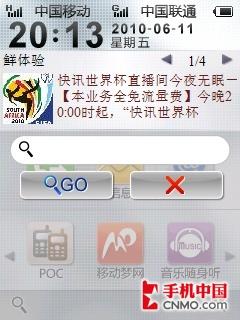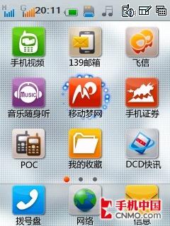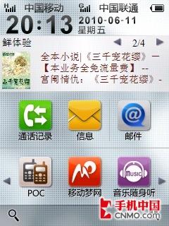 除了主菜单,酷派F668还有一个待机界面,界面大体分为三栏,上栏是快讯插件,可以呈现天气、新闻等信息;中间一栏则是通话记录、信息以及邮件;最底部一栏可以滚动,手机预置的移动定制功能都在这里显示。