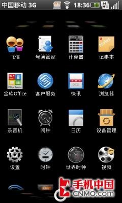 其实,两个主屏的切换只会改变手机桌面和菜单的界面,其他的二级菜单和程序界面都没有改变。我们分别进入到两个主屏的菜单中可以看到,OPhone 2.0的菜单界面经过了重新设计,在进入菜单的时候会有动态效果出现,而且图标的展示方式与Nexus one中的显示方式很类似,采用了竖向的滑动方式,给我们一种滚动的效果。