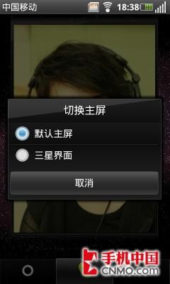 三星I7680还支持OPhone 2.0系统默认的主屏以及三星的主屏风格,两者的风格各不相同,我们可以在桌面按下菜单键,点击“切换主屏”,可以方便的进行主屏风格的切换。