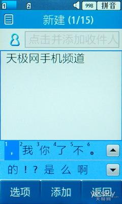 在短信方面,该机支持短息、彩信的收发。内置中文拼音输、手写、英文、数字、符号输入法。外屏操作时,只可通过手写输入文字,文字录入效率较为理想,平均一次书写20个汉字,可以有效识别出16个左右。使用键盘录入文字,内置的智能拼音输入法支持词组录入,加之手感出众的键盘,高效录入文字不是问题。
