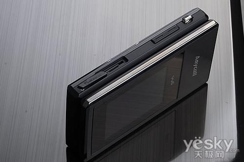 三星B7732采用双屏翻盖设计,但是手机造型并没有采用摩托罗拉V8风格的轻薄路线,厚实的机身也为机身侧面的接口按键提供了充裕的空间。首先在机身左侧音量控制键与microSD存储卡槽并存,同时为用户准备了DIY绳挂。