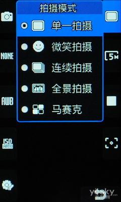 三星B7732配置的500万像素CMOS摄像头支持LED补光灯和自动对焦功能,在拍照模式上支持一般拍照、连续拍照、矩阵拍摄、相框拍摄、全进拼接、笑脸捕捉、面部美化;场景模式也多达14种,白平衡、效果与ISO功能一应俱全,从功能配置上讲,B7732已经可以媲美卡片相机。
