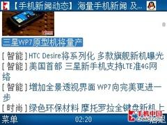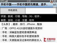 打开手机中国新闻中心(http://news.cnmo.com),虽然页面因为UC浏览器压缩后有点变形,但是不妨碍我看手机新闻,网页的打开速度还是非常流畅的,但是因为屏幕分辨率较小,在“晃荡”的公交车上,长时间看网页会产生视觉疲劳,算了还是看会窗外的风景吧(虽然满眼都是赶着上班的人们)。