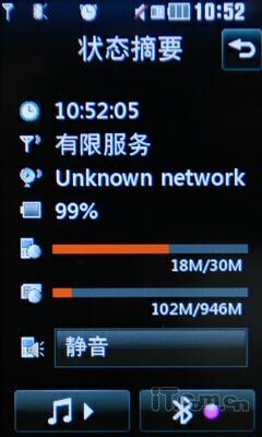 另外LG GS500v的"状态摘要"能够清晰的显示手机的各种状态,比如说剩余电量、内存状态、情景状态、网络状态等等,同时可以在这个界面直接调用音乐播放器和控制蓝牙功能。