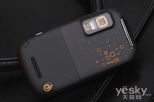 手机背面采用磨砂涂层塑料材质,手感十分细腻,但容易沾染指纹和油污还是令人头疼的一个问题。在背 板上镶嵌一颗500万像素数码相机,并搭配LED补光灯功能,此外可以看到手机标注有720P HD字样,该机支持720P级别的视频录制与播放,并且可以直播RMVB格式的视频文件,多媒体娱乐功能十分强大。