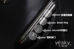 摩托罗拉XT806在机身四周的设计较为简约,机身右侧并没设计任何按键与接口,一行 MOTOROLA铭文传承者摩托罗拉经典传奇。在机身右侧则配置了大量的接口与按键,自上而下分别是音量控制键、SmartKey、microUSB接口 与相机快门,按键凸起明显,便于单手操作。