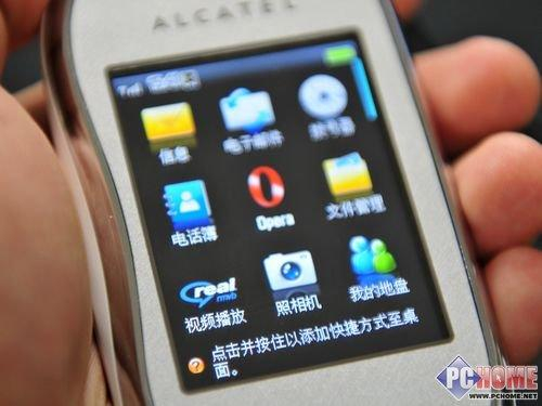 阿尔卡特OT-880使用的是一块2.4英寸的电阻触摸显示屏,分辨率为QVGA水平。在系统界面上,它融入了一些在时下流行的智能手机当中应用的一些元素,比如在解锁界面当中的滑动解锁的方式。