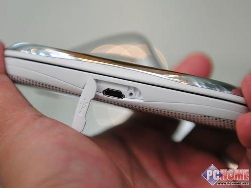 从手机正面来看,在机身的四周采用了线条较粗的镀铬装饰条,而整个正面的面板则是采用了一整块的设计,包括接听、挂机键和显示屏都隐藏在内,保证了机身良好的整体感,而菜单键和靠近顶部的听筒位置的一黑一白两条直线的设计也是相互辉映,很有意思。