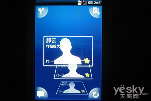 在介绍界面之前,我们有必要了解一下手机的系统版本,该机采用Android1.6版智能系统,这一点与X10i手机一致,并且搭载了索尼爱立信特色的Timescape功能,重新整合后的UI几面非常具有索尼爱立信特色。此外我们发现该机界面的动态效果非常出色,画面流程,没有一丝拖泥带水,流动间伴随一定的“弹性动画”,使得操作更加生动。