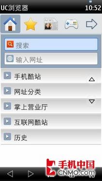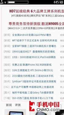 提起来手机浏览器,笔者就不得不多说几句。自带的浏览器功能着实强大,在打开手机中国首页时,对Flash的支持居然很完美。以下是Symbian^3手机自带浏览器打开手机中国首页的截图。