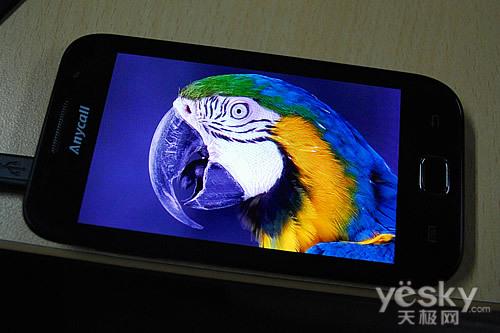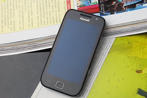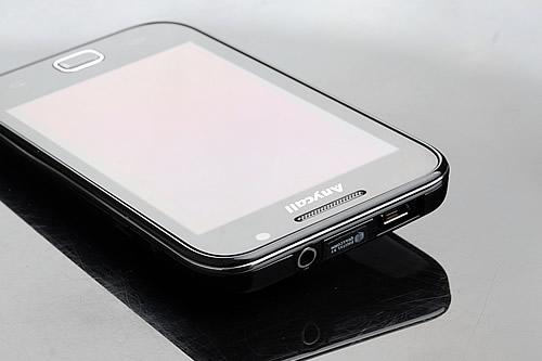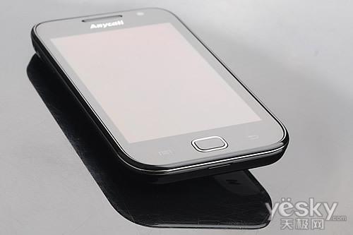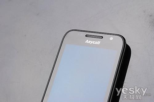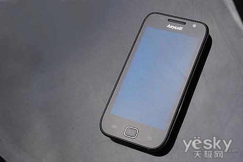 在机身正面部分,我们看到了熟悉的Anycall标识,这也是三星行货手机的基因元素,屏幕上方保留了前置摄像头元素,并且配有光线感应器,这也是触屏手机必备的元素之一。在屏幕下方,简单的三颗成一字形排列,Menu与返回键依然采用热感式触摸按键吗,虽然保证了镜面机身平整度,但还是有误操作出现的可能性。
