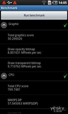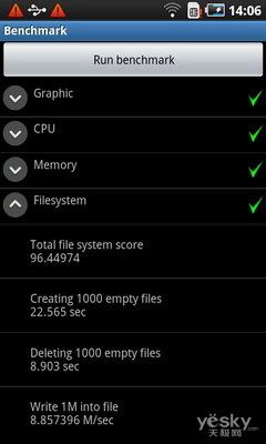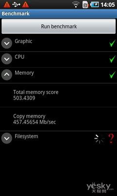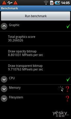 我们还是采用专业的Benchmark测试软件对手机的CPU、图形处理、文件系统与内存性能进行测试,跑分的结果非常令人满意,即便是同样1GHz主频的Snapdragon处理器手机,在CPU环节也甘拜下风,而强大的运行内存,让手机在内存测试环节也有着惊人的表现。由此可见,三星i909在性能上的表现堪称旗舰。