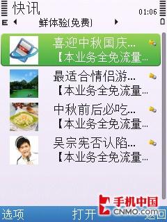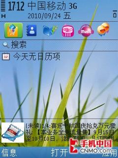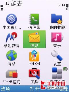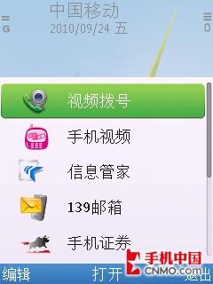 手机的桌面依然采用了诺基亚Symbian S60 V3的经典样样式,不过我们可以看到有许多中国移动定制的业务,再次印证了这是一款由中国移动定制的手机。不过我们在使用的时候感觉这些图标以及插件拖慢了系统的运行速度。