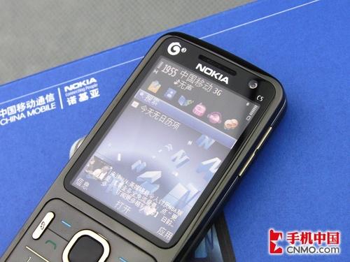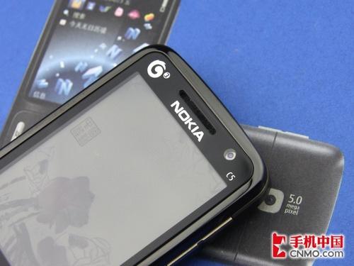 在屏幕的上方我们可以看到除了印有“Nokia”的标识之外,还印有中国移动“G3”的LOGO,说明了这是一款由中国移动定制的手机。在右上角还安排有一个副摄像头。