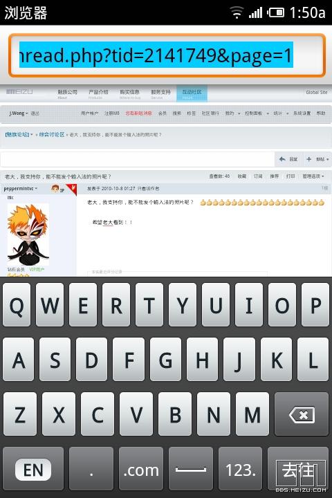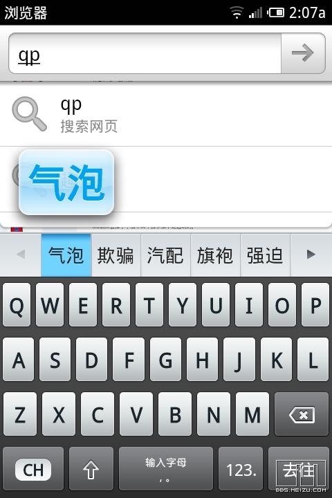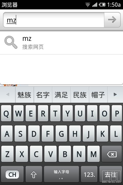 在三张输入法界面,我们看到了魅族M9的中文输入依然强悍,支持词组的输入,同样支持网址输入时的“.COM”快速输入以及“前往”按钮等,中文输入选词的时候也是采用了非常华丽的炫光样式。
