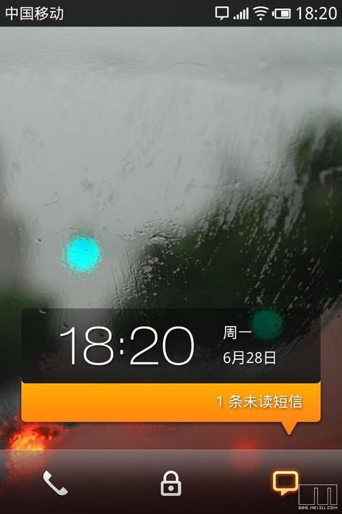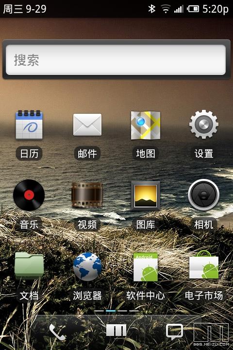 界面的底部拥有三个透明按键,分别可以打开拨号界面、菜单界面以及短信界面,桌面的图标依然采用的是魅族M8的图标风格,桌面上可以安排4×4供16个图标(搜索框占用了四个图标位)。