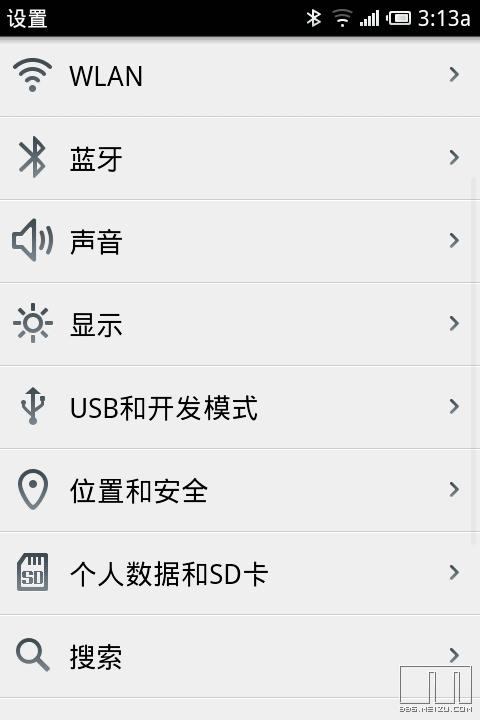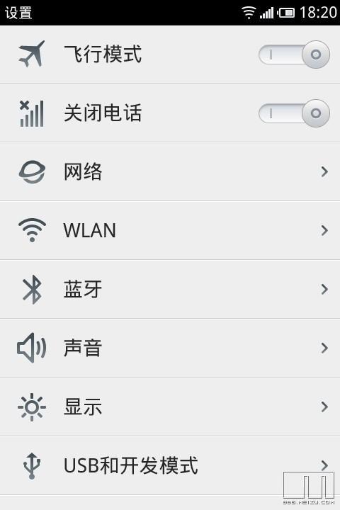 在设置界面中,同样采用的是与魅族M8最新版本的官方固件一样的风格,白底黑字,显得非常的简洁,可以让我们快速找到设置选项。