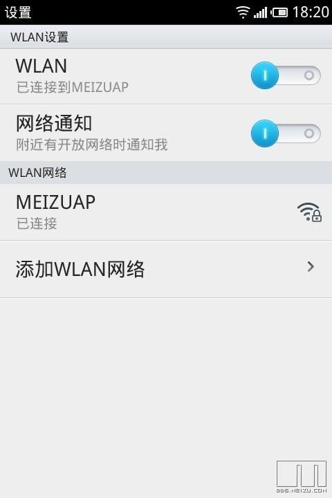 在设置界面中我们可以看到,魅族M9同样支持Wi-Fi连接,连接的虚拟按钮与魅族M8有所区别,将方形的按钮换成了圆形的开关了。