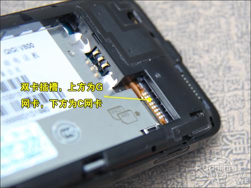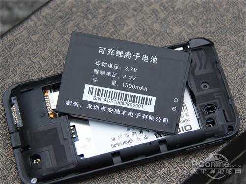 琦基V800的后盖打开关闭都比较困难,不给点力还真不能轻松地做到。打开之后,1500mAh的电池占据了很大的空间,下方则是两张卡的插槽,上方是G网卡,下方是C网卡。这种上下的插槽设计使用过程中觉得插拔都不是很方便。
