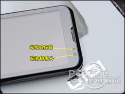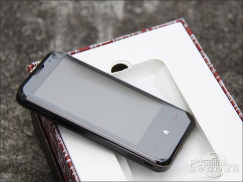手机正面的纯平镜面设计使其在阳光下就如同一块反光镜。3.6寸的电阻触控屏占据了大部分的空间,这款TFT材质的屏幕在室外阳光下比较容易出现亮度不够的问题。屏幕上方依次分布了听筒,光线感应器和前置摄像头。屏幕下方则是触控键三枚,分别对应拨号,主页和挂机功能,在使用过程里触控键反应非常灵敏,甚至有时会出现误操作的现象,刚刚入手的用户可能需要一段时间适应。