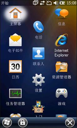 WM6.5虽然相比过去版本有了较大改进,但易用程度和美观程度上还是需要提升,这也是HTC sense和三星TouchWiz等厂商UI的出现原因。琦基V800并没有大刀阔斧地推倒重来,仅对原生界面做了小小的修改,比如说把开始菜单移到了屏幕下方,在上方状态栏加入两张卡的状态信息等。其他的诸如锁屏菜单,开始界面,蜂巢状的程序菜单,风格诡异的对话框等一一保留。