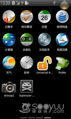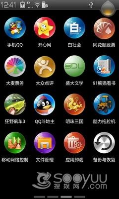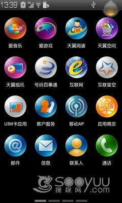 进入主界面之后可以看到本机的图标是以4×4排列的。里面默认的程序都是圆形的图标,在联想樂应用商店里下载的也是圆形的,不过其他第三方自主安装的程序是普通形状的。在这里可以看到大量中国电信定制的程序。