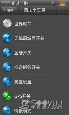 中国电信版的乐Phone在主界面中样式和W版一样。只是在顶部位信号上可以看出是中国电信的CDMA 1X网络。另外点击屏幕底下的圆圈键,可以切换到经典的6页功能菜单中,其中包括有网络连接、推送服务等等。而长按这里也可以弹出添加小工具的菜单,可以看出Android的影子。