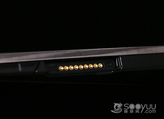 机身左侧的部分上面黑色的部分是手机的音量键,下边有一个黑色的盖子,用手轻轻一抠就掉下来了,小盖子里面是一排点状的金属触电。这就是乐Phone独特的电源/数据线接口。而更绝的是手机与数据线的接口是具有磁力的,只要将两个端口靠近就会自动吸附上去。