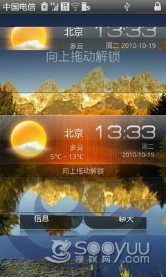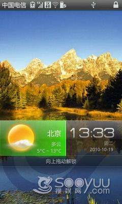 首先是本机的解锁界面,沿用了经典的滑动解锁样式,如果正在充电还能再解锁滑动条上显示出百分比,非常漂亮。将这个滑动条向上拖动就可以进入主界面了。