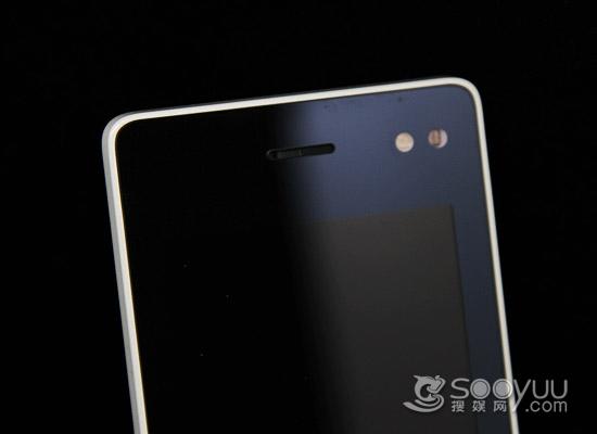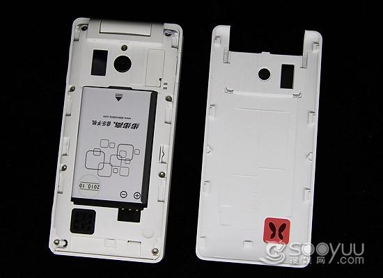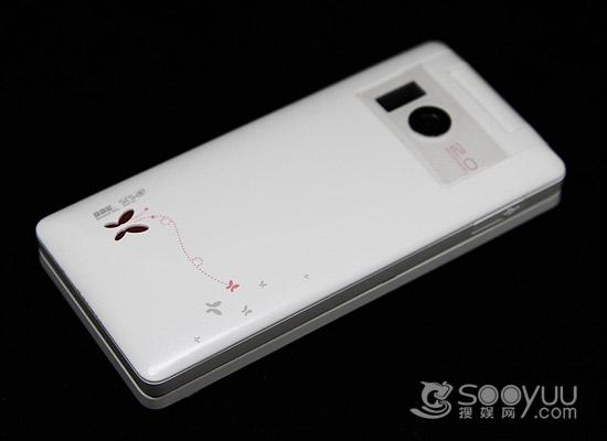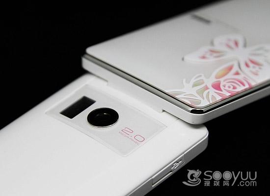 翻到手机的背面,在这里我们依然可以看到“化蝶”的元素。整体来讲背部整个都是电池后盖,同样采用了白色的设计,上边是摄像头,下边是具有蝴蝶图案的扬声器,很自然,也很美。