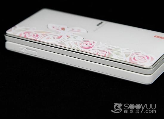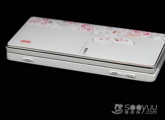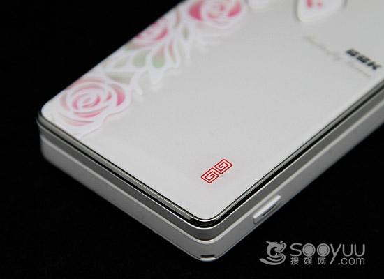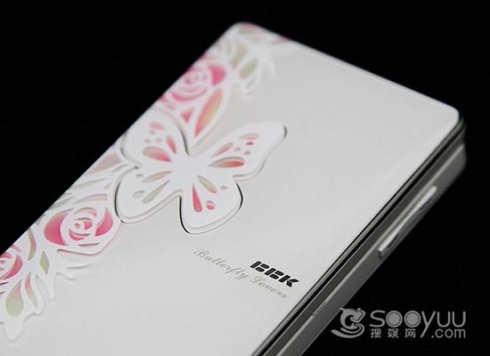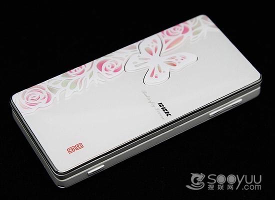步步高i606手机上市之后会推出两个版本,分别为白色版和黑色版,本次我们拿到的机型是白色版,十分唯美。可以看到手机的正面图案非常的漂亮,加入了鲜花和蝴蝶的设计元素。在手机的外面有一层透明的材料,看上去使图案更加具有立体感,让人耳目一新。