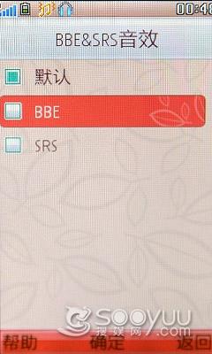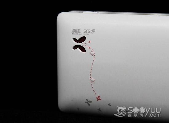 在机身的底部配置了本机的扬声器,而这个扬声器被设计为了蝴蝶的样式,和机身整体的风格保持一致,另外在这只“蝴蝶”的旁边还印有BBE和SRS音效的字样,在之前对步步高两款音乐手机的实际评测过程中,我们也见识过了它们的厉害。