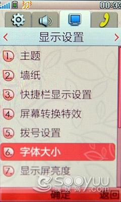 进入主菜单之后发现本机的主题之一把12个功能应用都集中在下边,上边是关于当前应用的动画演示,非常漂亮。在显示设置中,步步高i606还可以对字体大小、屏幕转换特效等内容进行设置,非常个性化。