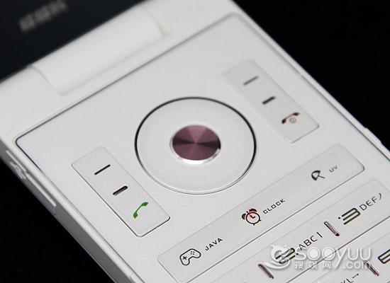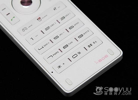 接下来看步步高i606的键盘,上边是一个圆形的五维导航键以及常见的接听键、挂机键。另外在下边还有三个特殊应用的功能键,分别为JAVA应用键、闹钟键以及UV检测快速功能键。