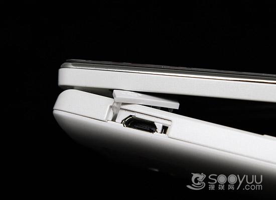 在机身的左侧顶部仅有一个数据线的接口,这个接口是目前最常用的microUSB制式,除了支持数据传输之外还具备充电和连接耳机的功能,表现很全面。不过步步高i606和之前我们评测过的几款步步高音乐手机一样不支持3.5mm耳机接口,比较遗憾。