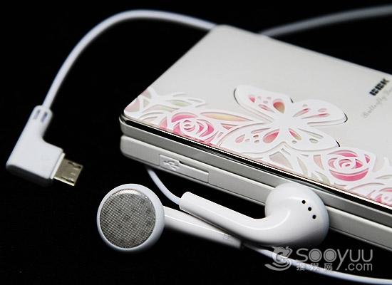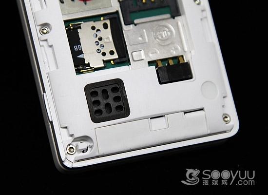 在下边一点的位置是一个microSD储存卡卡槽,本机默认配置了一个1GB的储存卡,而用户可以最大扩展到32GB,可以放入海量的多媒体文件,绝对足够使用了。