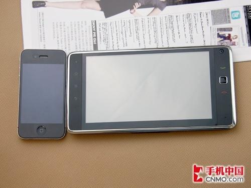 华为S7的外观成为了我们这次非常关注的对象,因为它拥有着一块7英寸的宽大触摸屏,所以机身的尺寸也随之显得非常的大,从下面的与iPhone 4对比图片中可以看到,S7的宽度与iPhone 4的长度几乎相当。
