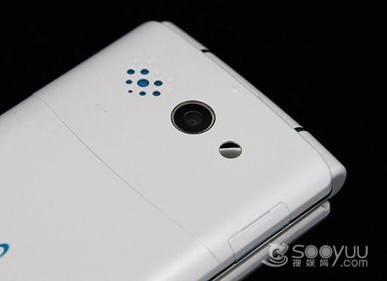 在手机顶部我们发现本机配备了一枚200万像素的摄像头,旁边分别还有一个扬声器以及自拍镜,虽然没有LED补光灯装置,不过很久不见的自拍镜更适合MM们使用。