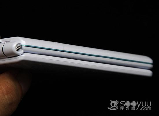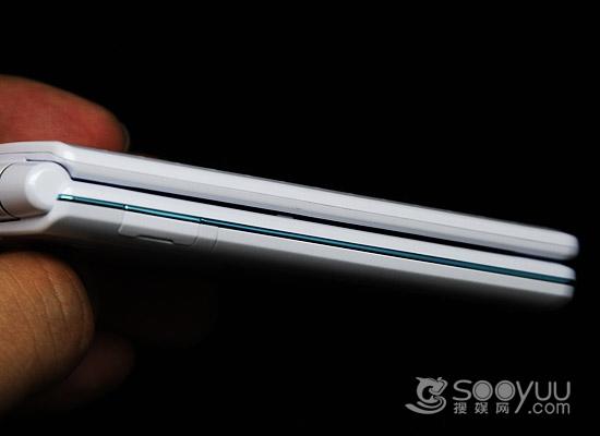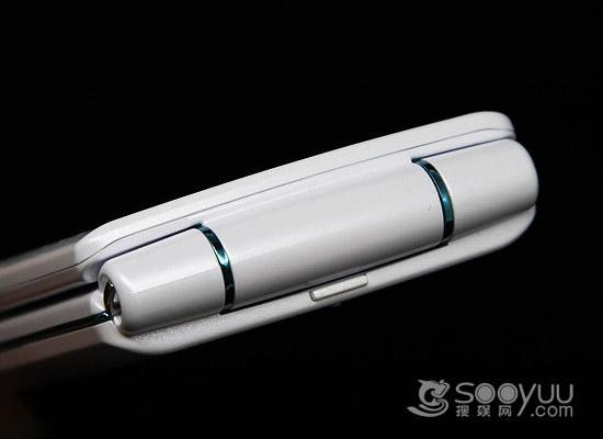 由于本机是一款定位于时尚的手机,而且并没有采用高端的硬件配置,所以在机身四周格外的简单,首先在机身顶部没有任何配置,可以看到轴上边有两根绿色的装饰线。