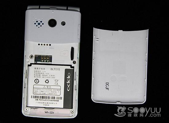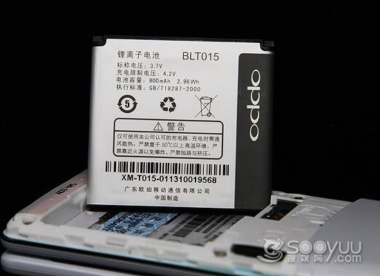 打开OPPO U521的手机后盖可以看到一个型号为BLT015的电池,容量为800mAh,对于这款时尚翻盖手机来讲也是可以接受的。