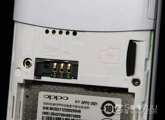 在电池仓的顶部可以看到一个SIM卡的卡槽,本机并不支持3G网络,所以只能放入普通的GSM网SIM卡。