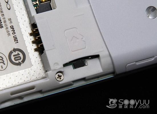 关于本机的储存卡在机身的右侧,OPPO U521最大支持32GB的microSD储存卡,足够使用了,而从储存卡槽的位置也能看出本机是支持热插拔的。使用起来非常方便。